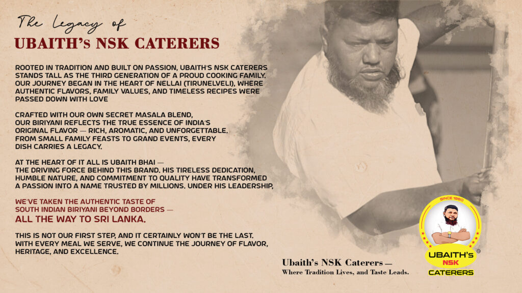 Rooted in tradition and built on passion, UbaithsNSKCaterers stands tall as the ThirdGeneration of a proud cooking family.
